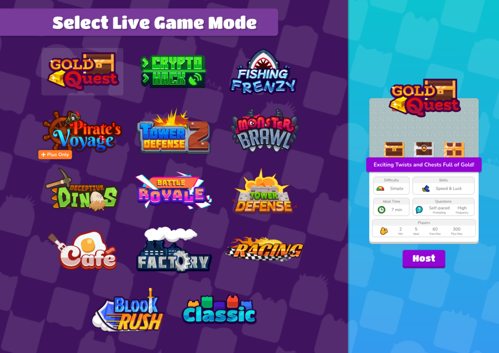 First, a Blooket Host logs into their account and chooses a question set. Next, a game mode is selected, such as Gold Quest or Tower Defense. After that, the host clicks “Host Game” to start.